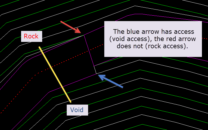 Figure 3: In this image, the blue arrow has access (void access), the red arrow does not (rock access). The yellow arrow indicates the movement of the pit up, with the top being rock, bottom be void (into the pit).