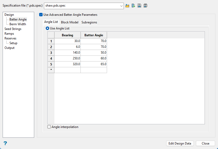 Then, use the rest of the grid to enter either the batter angle for each subregion or specify an angle list. An example angle list is shown below.