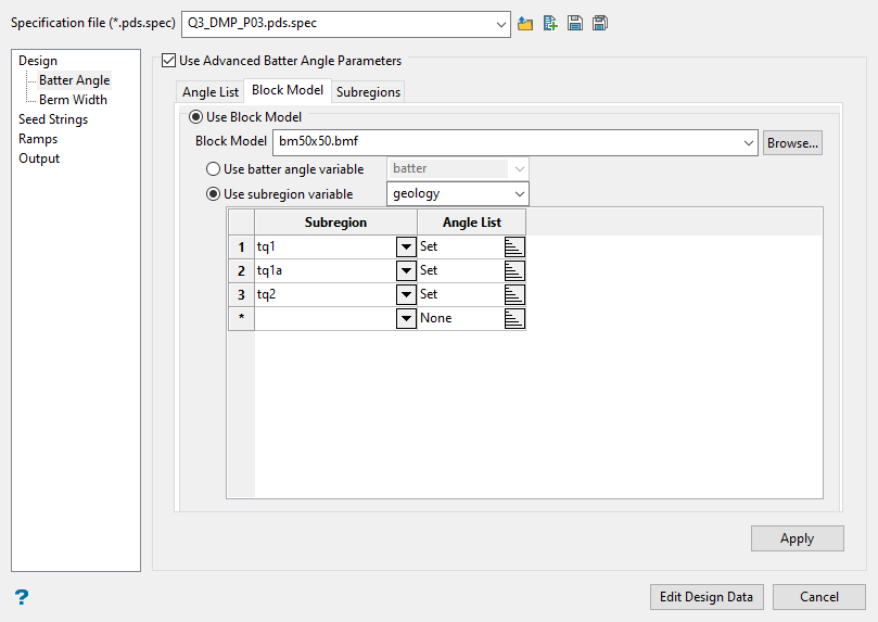 Once the block model is selected, there are two ways to supply the batter angle Information: batter angle variable or subregions variable.