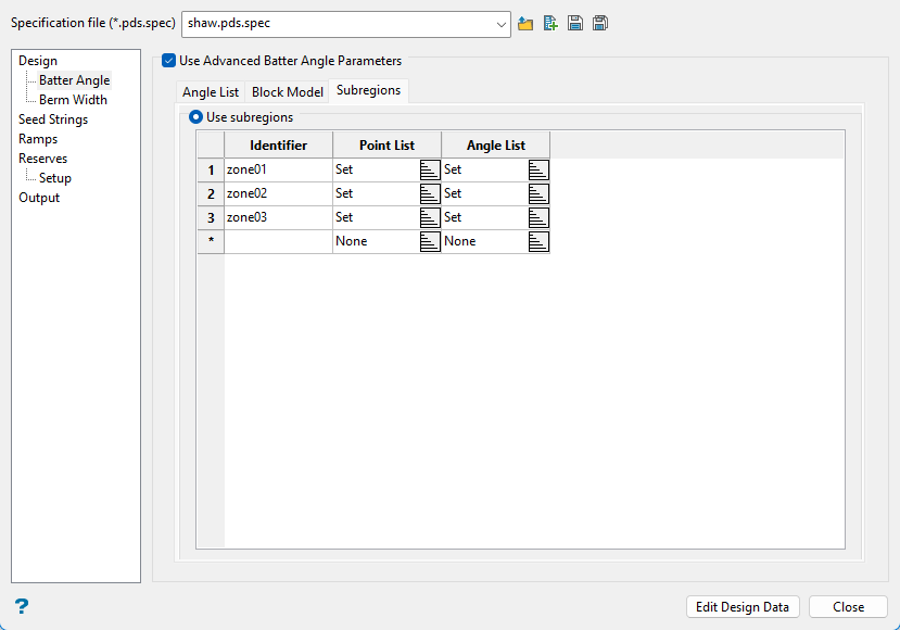 Any subregions without an associated batter angle or angle list will revert to the default batter angle. Any inappropriate values (such as -99) will also revert to the default batter angle.