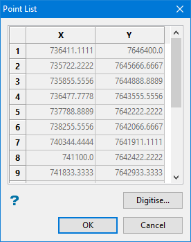 Clicking this will allow you to draw a polygon that outlines the boundary of the region. The X and Y coordinates of each point along the string will automatically be listed in the table., or enter the coordinates individually, then click OK.