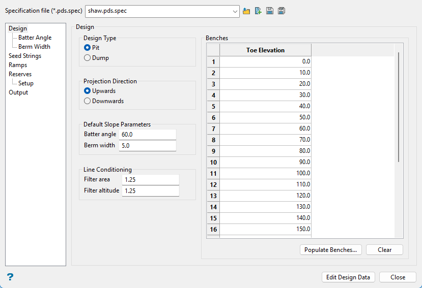 When the pit designer is constructing a design it will either progress upwards through the benches from the lowest elevation to the highest elevation, or downwards in the opposite direction. The process that the designer uses depends not only on the design direction, but also on the design type.