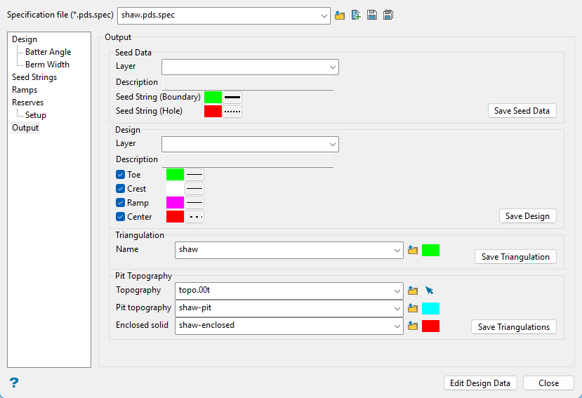 Toes, crests, ramps, and centrelines can be saved to a design layer. Select the appropriate checkboxes and specify the string colour using the colour box. Click Save Design.