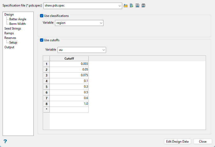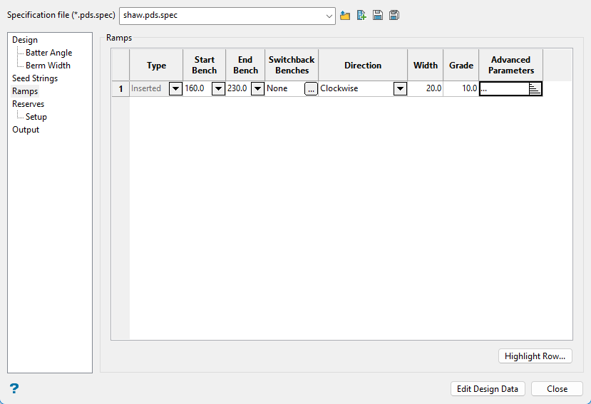 Use this to select the design as either a pit or a dump. This determines how certain parameters will be utilized such as Rock/Void Access for a ramp.