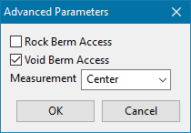 Advanced Parameters - Rock access leaves the catch bench/berm open to the road versus narrowing out and cutting it off on each bench. It's the same for void berm access except that is into the pit out from the dump (away from whatever the material is).