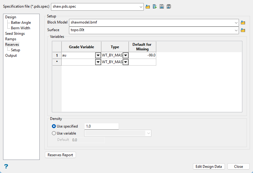 Supply a Default value if you want to replace the construction default of the selected blocks during the reserve calculation. The construction default value is reported in a block model header.