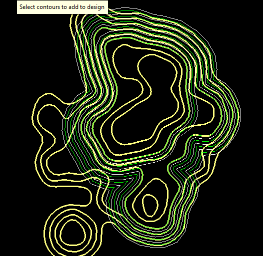 Select the contour lines you want to import into the pit designer to become seed strings. Click on a string to select it, and a preliminary pit design will be created. If you make a mistake or wish to select a different line, simply click on the string again to deselect it.