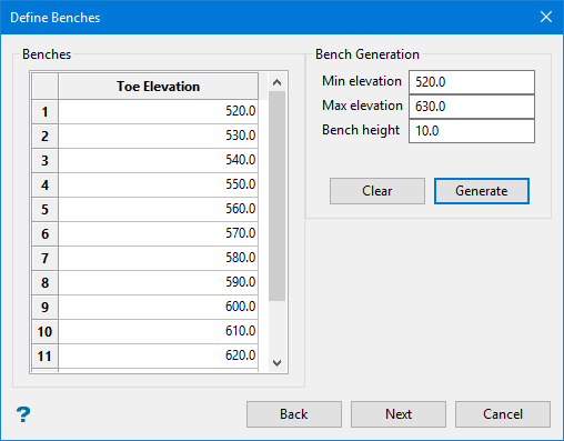 If you selected the selected the Contour existing block model option, the minimum and maximum bench elevations will automatically be calculated. You will just need to enter the Bench height, which defines the height of a single bench.