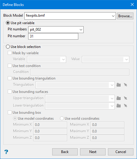 Select the Use bounding surfaces checkbox to restrict the blocks by bounding surfaces. Select triangulations from the Upper triangulation and Lower triangulation drop-down lists, or click Browse... to select triangulations from a location other than your working directory.
