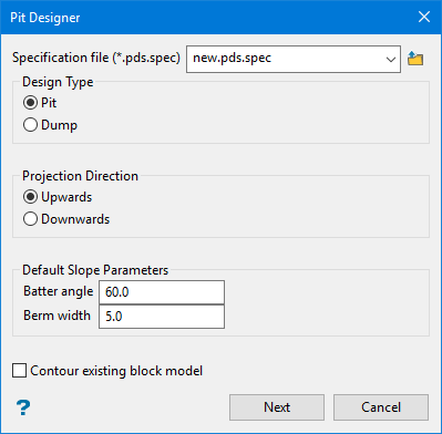 If you did not selected the Contour existing block model option, you will need to specify the Min elevation, Max elevation, and Bench height. You can edit these settings later, but the pit designer needs at least two benches to work with.