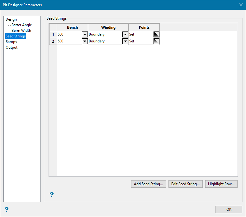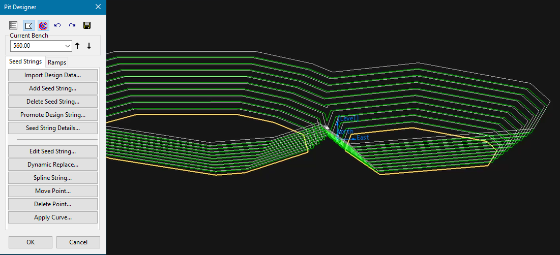 One of the differences between this tool and other pit design tools is that you will not be drawing the toes and crests of the pit directly. Instead, you will be creating a recipe formed of seed strings that will turn into your design.