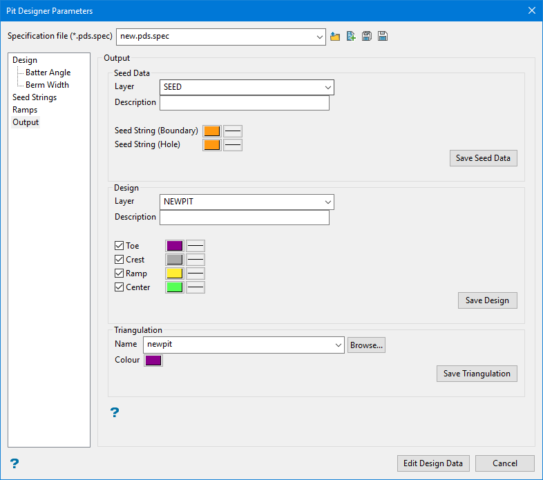 When you have a design that you want to keep, click Save to display the Pit Designer Parameters panel.