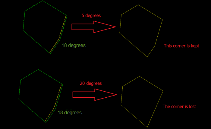 This parameter is used to define if two lines are parallel. If two lines are found to be parallel, they are combined to one. The smallest accepted value is 0 degrees. The default is 5 degrees, and there is no limit to the maximum, but the process will fail if you put an angle close to 90. In Diagram 3 below, the top example shows a line segment (highlighted by a dashed yellow line) with angle of 18 degrees. Since this is greater than the minimum parallel angle tolerance of 5 degrees. Therefore, the angle remains in place. However, in the lower example, the same 18 degree angle is less than the minimum parallel angle tolerance of 20 degrees. Therefore, the angle is removed.