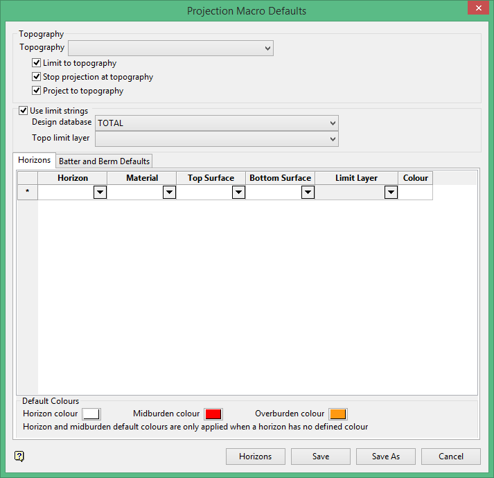 Select the default colours for the Horizon, Midburden, and Overburden from the Colours pop-up.