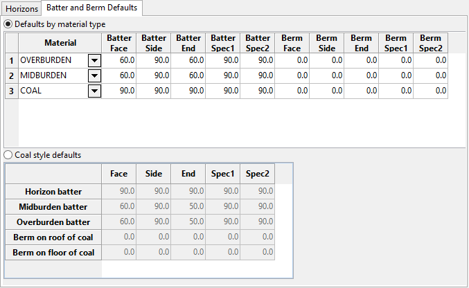 Note: The default values from the nominated topography (.tpg) file will populate the Batter fields. You may change them as desired.