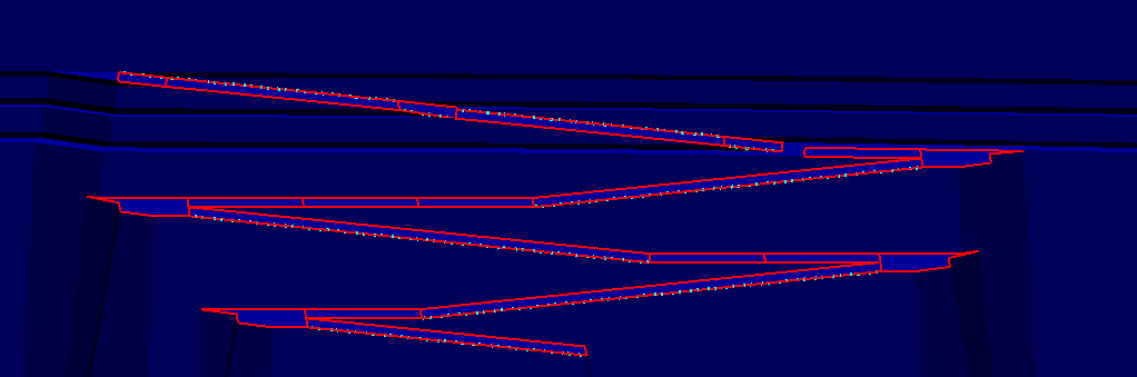 Automated road construction is useful when working with multiple strips. To automate the road construction process, you need a saved road layout. This is made once you complete construction of a road or halt construction midway due to an error, AND if Retain road construction is selected in Road Parameters > Highwall > Saving.