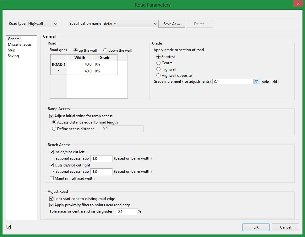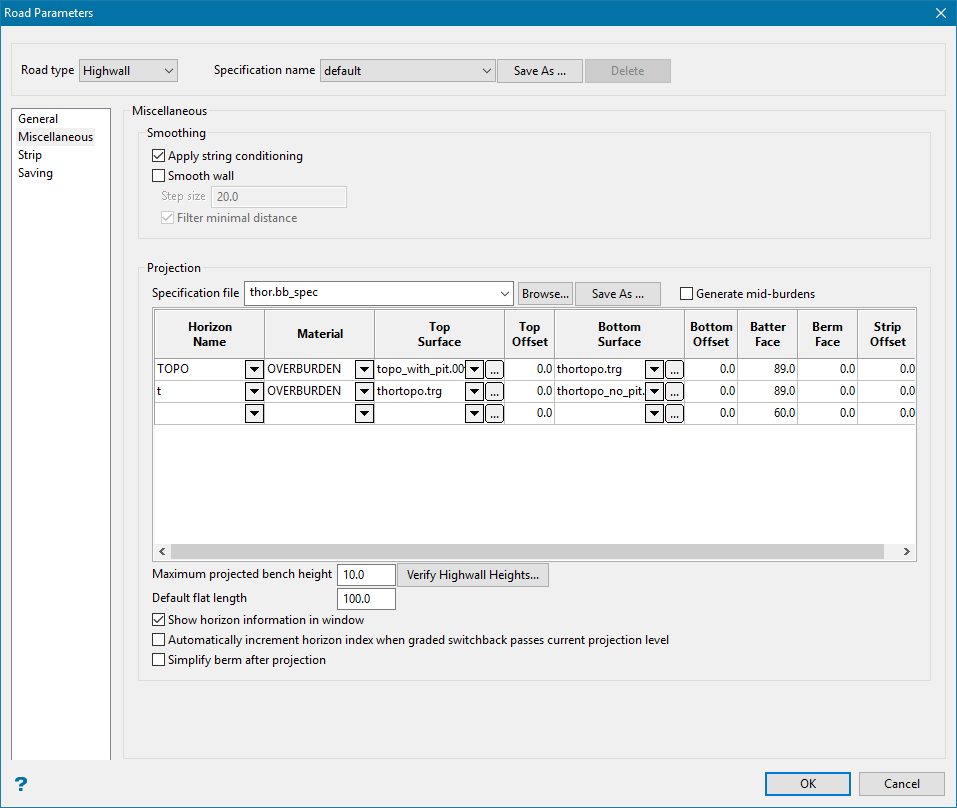 Road Parameters - Highwall - Miscellaneous panel