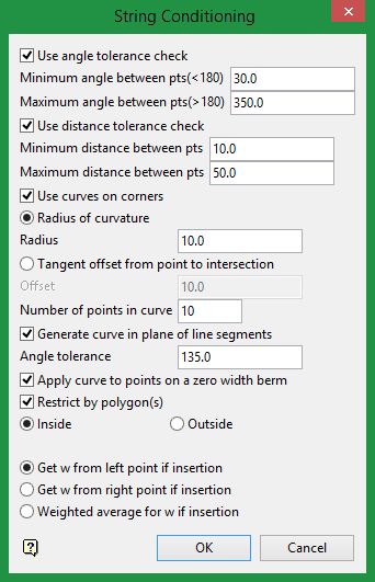 String conditioning carries out checks on points in toe or crest strings. The String Conditioning panel will appear once you complete the Miscellaneous panel and click OK, letting you specify the string checks to be carried out.
