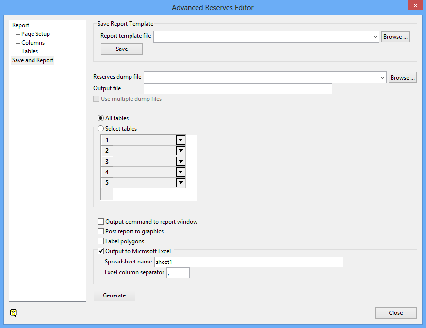 Select this option if you only want to include specific tables in the resulting report. When the report is displayed, the tables will appear in the order that they were selected. The drop-down list displays all of the tables listed within the nominated reserves specification file (.res).