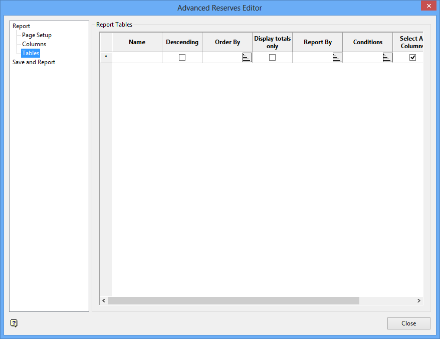 This section also to add, delete or change tables in the report tables list. For each table, you specify the columns to be reported, the columns by which to order and whether or not only totals are to be reported. Up to 60 tables can be specified.