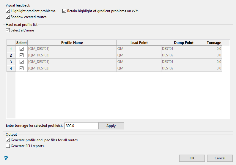 Enter the estimated tonnage for each profile, then click the Apply button. The tonnage will be applied to every route profile that has the Select checkbox enabled.