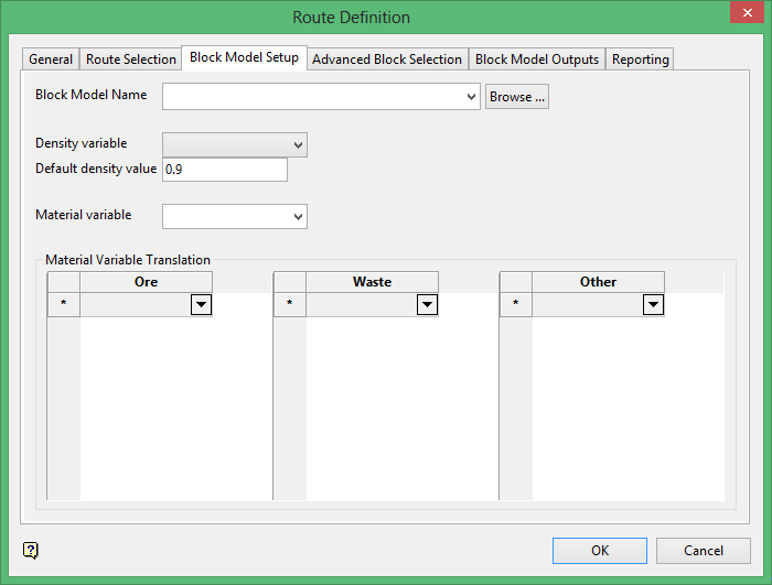 The category to be configured in this panel depends on whether the Material code set in Block Model Setup references a type of Ore, Waste or Other material. If one of the Ore, Waste, Other categories in the Block Model Setup panel does not have a material variable configured, then the corresponding Routes/Variables section in this panel will be unavailable.