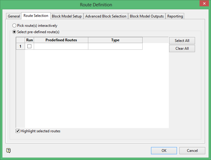 Select this option to access a list of routes previously set up in Build Haulage Route Network > Create Haulage Route.