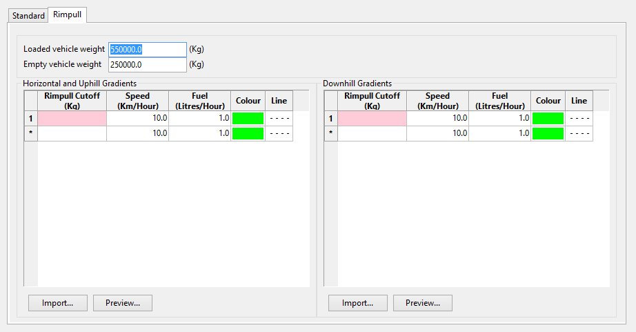 The Rimpull tab allows you to calculate cycle times and fuel usage from Rimpull curves as an alternative to speed curves. The Rimpull curve is calculated from the following calculation: