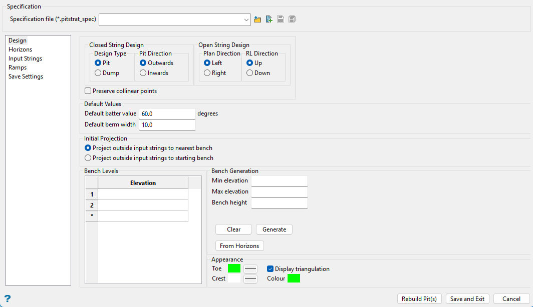 This section allows setting up the direction the pit is built (up or down) along with the default berm batter/projection values. It also deals with defining the bench range, which is a range of values in the z/RL direction.