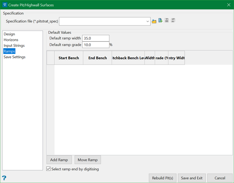 This section allows inserting and modifying ramps into currently existing pit(s)/highwall(s).