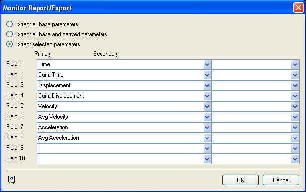 The information reported can consist of all base parameters (that is, base and extra parameters, but excluding secondary parameters); base parameters and derived parameters (that is, base and extra parameters, including secondary parameters) or selected parameters.