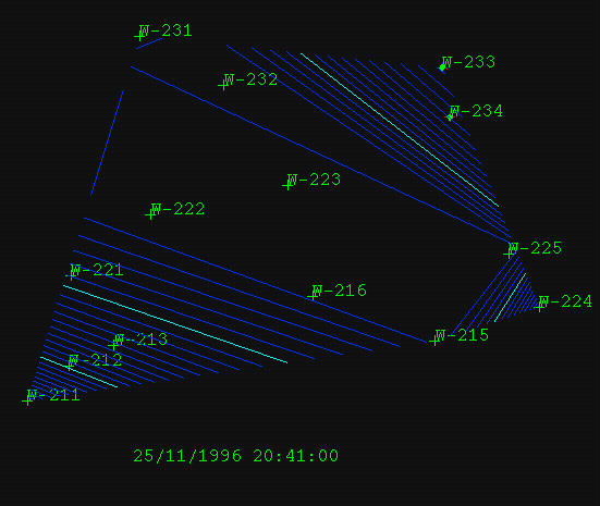 A set of contours is generated for each sample monitor locations, at each time recorded (similar to triangulated surfaces). This is useful in the visualisation of surface variation over time (use non-exaggerated point data). The process can be cancelled by pressing the [Esc] key.