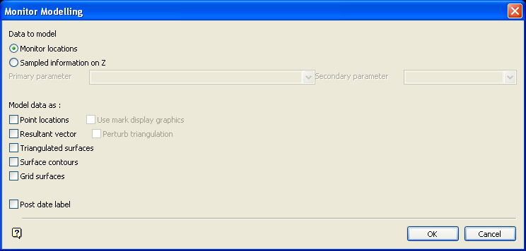 Use the Model option to create models of the monitor data, that can then be used with the View > Animation option to provide 4D visualisation. The resulting model, may consist of triangulated surfaces, resulting vectors, grids, contours or point data. A model is generated for each time period (each sample location).Instructions