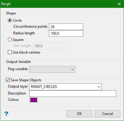 Any series of points can be used, however, we recommend using points that were created through other options under the OilSands Options submenu. For example, the Total Volume In Place option creates a series of layers including some that contain points along the floor of mineable surfaces. The W-tag value for these points are flagged by bitumen, thickness etc. The Ring It option will take these values and assign them to all blocks above the elevation of these points.