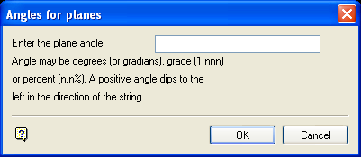 Use the Define Angles option to assign an angle value to one or more line segments, which in turn can be used in the Planes option to create a planar surface. For this option, you will need a digitised string that has one or more line segments that correspond to the axis/axes of the intended planar surface(s).