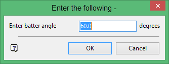 Enter the batter angle. The angular units (either gradians or degrees) is set through the Miscellaneous section of the Tools > Preferences option. Any face that is not assigned a batter angle in this option will have the default angle applied (set in the Project string option or, if using the Ramps module, then the Project string function in the Ramps > Design Pit/Dump option).