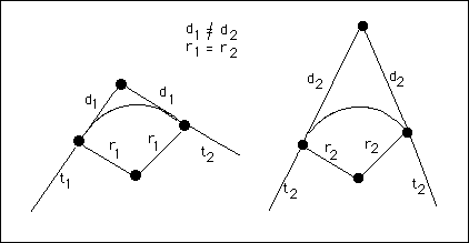 Select this option to specify the curve by a tangent offset from the point of intersection. This means that the distance "d" is constant, and the radius of curvature is varied to accommodate different angles of the line segments.