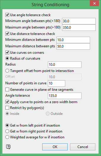 When the point spacing does not satisfy the conditions specified, points are added or deleted from the object. When the angle conditions are not met, the point at the apex of the angle is deleted. Curves can also be used to replace angles in the toe/crest string. Curves are fitted using the Ramps > Apply Curve option.