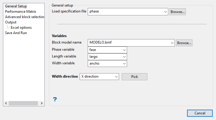 Use this option to calculate the average width and length according to a flagged phase variable in a nominated block model. This option is useful when wanting to assign performance according to geometric constraints.