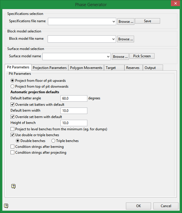 On the Open Pit menu, point to Open Cut Design, and then click Phase Generator to display the Phase Generator panel.