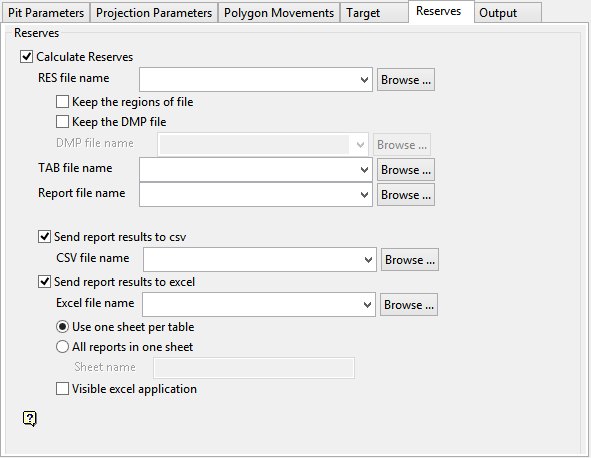 Select this checkbox to calculate the reserves. You will need to specify the name of the reserves specification (.res) and report specification (.tab) files to be used, as well as the name of the resulting report file (.rep).