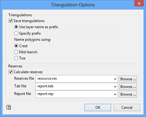 Use this option to create a separate triangulation for each bench of a loaded pit. This option also automatically calculates the reserves using a predefined .resfile and a .tabfile, and reports the reserves to a specified report file (.rep) as well as display them in the Report Window.