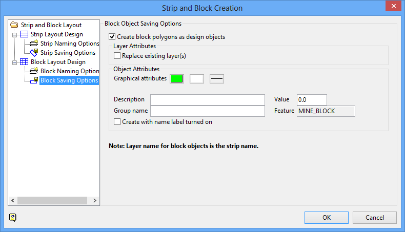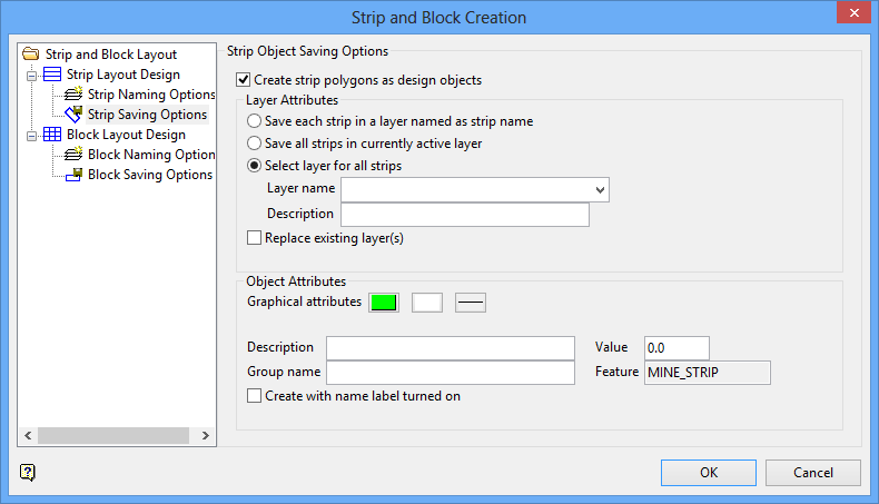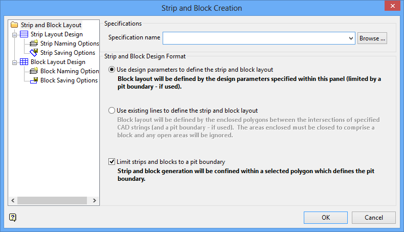 The Create Strips and Blocks option to design mine strips and/or blocks along a nominated line or polygon. This forms the basis for strip and block reserves calculations.