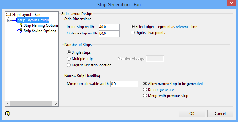 Enter the minimum allowable width. Strips less than the specified area will not be created. Use the default value of '0.0' if you do not want to apply a restriction. Select how you want strips which violate the minimum allowable width parameters to be treated: