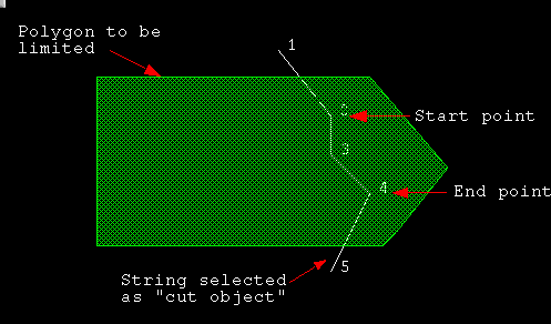 You will then be asked to select start point. In selecting the start and end points, the limiting string is defined. This can be the entire intersecting string selected (cut object), or a portion of it.