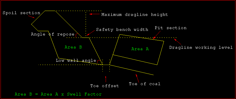 The Dragline Spoil option to create profiles (along the length of the pit) and spoil pile sections that would be produced by a dragline mining the strip. A typical pit and spoil section is shown below.