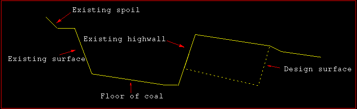 The first surface or new design surface is the surface triangulation for the pit to be mined, consisting of the new highwall and roof of coal. The second surface, or the existing surface model, is the old surface. The second surface is made up of the existing pit high wall, the floor of coal previously mined and the existing spoil pile. The existing spoil can be a designed surface, a survey of the spoil pile or a previously designed spoil surface.