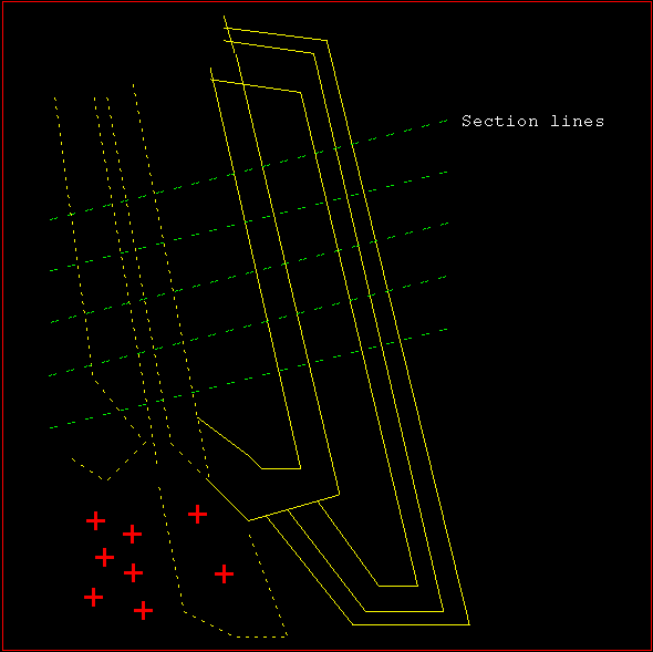 The workings consist of a set of cross section lines generated through either the Create Sections or Insert Sections options. For spoil sections, the sections must go from the spoil side to the highwall side of the plan. In the following diagram, the existing spoil area is on the left and the pit is on the right, so the section lines must be designed going from left to right.