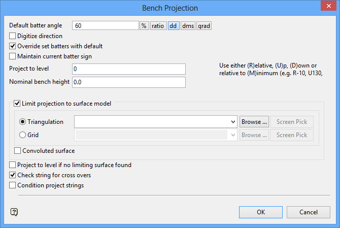 Once selected, you will be prompted to select the pit outline to project (that is, the starting string). Upon selection of the outline, the Bench Projection panel displays.