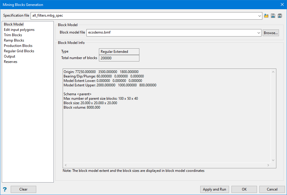 This displays important information about the block model that may be needed when filling in the parameters for the panels to follow.
